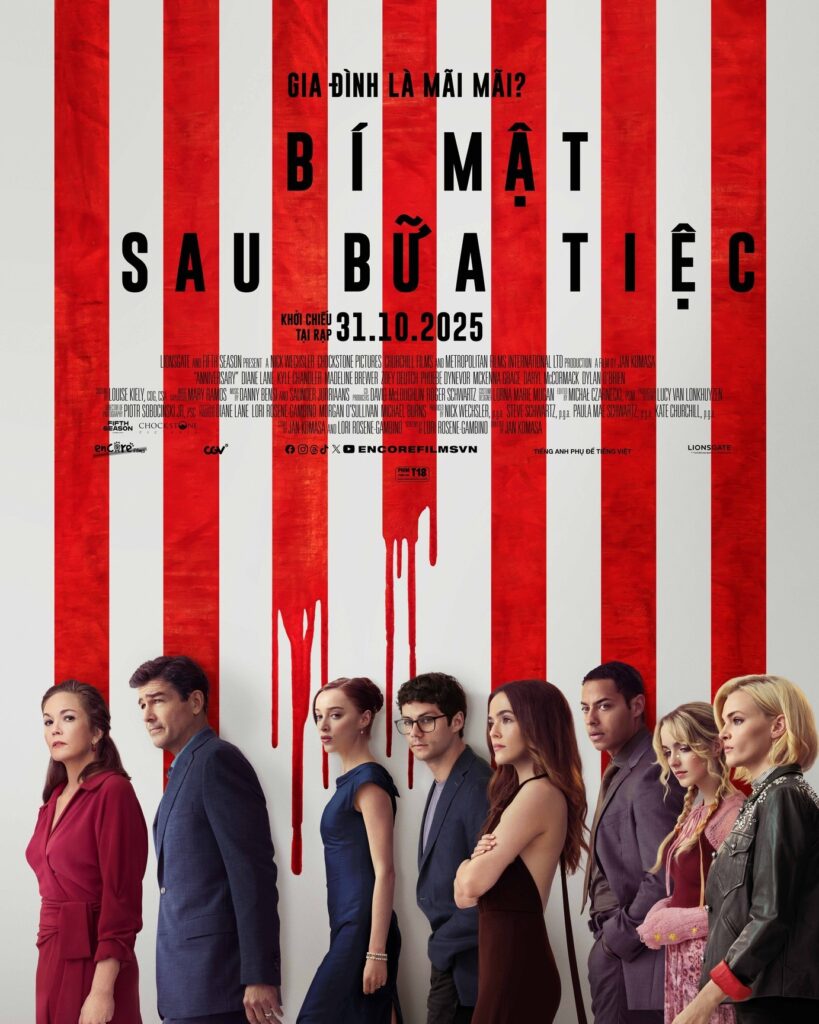 Dịp cuối tháng 10 này, màn ảnh rộng Việt Nam sẽ chào đón Bí Mật Sau Bữa Tiệc (Anniversary) – siêu phẩm tâm lý giật gân hứa hẹn “đốt cháy” mọi rạp chiếu. Bộ phim quy tụ dàn sao hạng A Hollywood như Diane Lane, Kyle Chandler cùng cặp đôi được yêu thích Dylan O’Brien và Phoebe Dynevor, sẵn sàng bóc trần những góc khuất đầy ám ảnh đằng sau vỏ bọc hoàn hảo của một gia đình trí thức Mỹ.